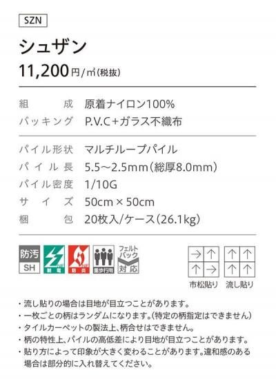 こちらのページでは、2025年10月に発売されたシンコールのタイルカーペットカタログ「 SQ PRO TILE CARPET2025-2028」掲載商品 シュザン(SZN-2231,SZN-2232,SZN-2233)がご購入頂けます。リフォーム、リノベーションなどDIYでの模様替えにおすすめです。 無料カットサンプルもご活用ください。3品番まで手配可能です。商品は注文確定後、2~3営業日以内に出荷予定です。
