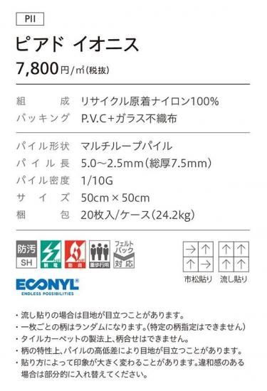こちらのページでは、2025年10月に発売されたシンコールのタイルカーペットカタログ「 SQ PRO TILE CARPET2025-2028」掲載商品 ピアド イオニス(PII-511,PII-512,PII-513,PII-514)がご購入頂けます。リフォーム、リノベーションなどDIYでの模様替えにおすすめです。 無料カットサンプルもご活用ください。3品番まで手配可能です。商品は注文確定後、2~3営業日以内に出荷予定です。
