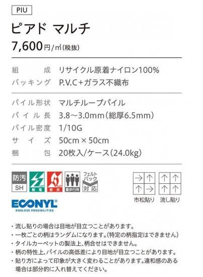 こちらのページでは、2025年10月に発売されたシンコールのタイルカーペットカタログ「 SQ PRO TILE CARPET2025-2028」掲載商品 ピアド マルチ (PIU-441,PIU-442,PIU-444,PIU-445,PIU-446,PIU-448,PIU-449,PIU-450)がご購入頂けます。リフォーム、リノベーションなどDIYでの模様替えにおすすめです。 無料カットサンプルもご活用ください。3品番まで手配可能です。商品は注文確定後、2~3営業日以内に出荷予定です。